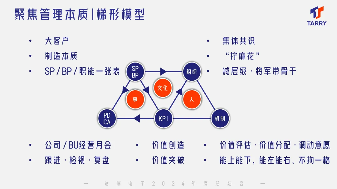 “梯形模型”以SP/BP为出发点,将大客户和制造作为米兰MILAN(中国)一切战略的圆心,最终形成覆盖所有部门的战略与经营一张表,以进行时刻检视和纠偏。